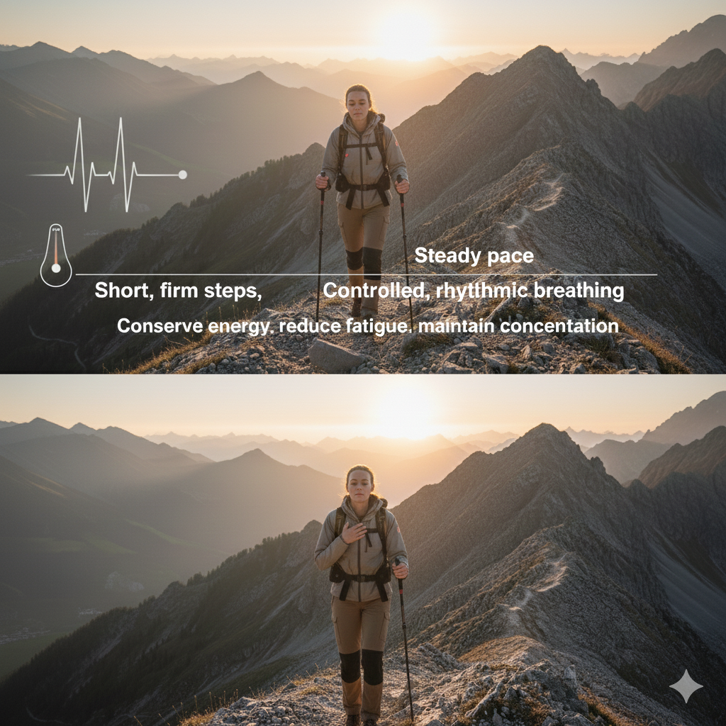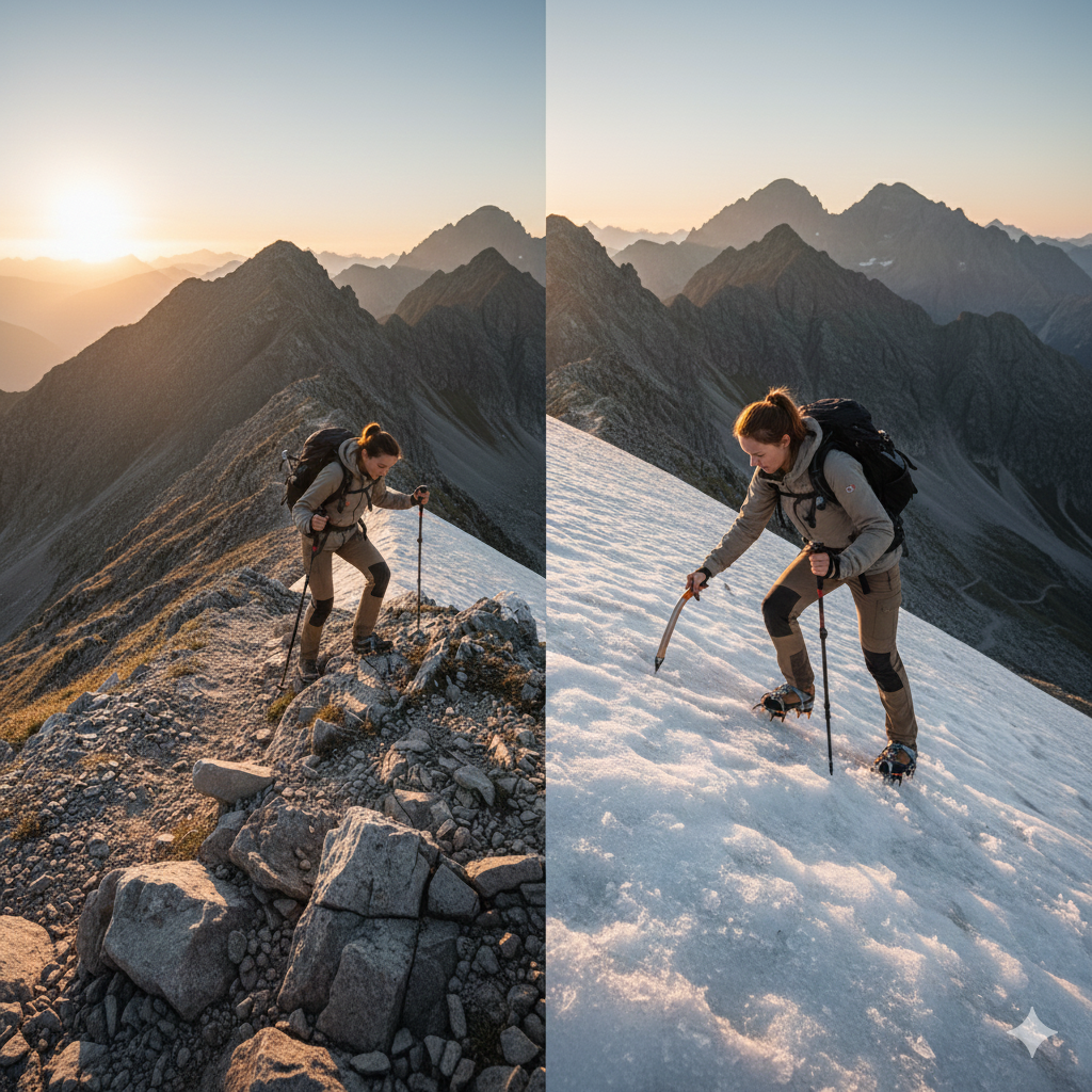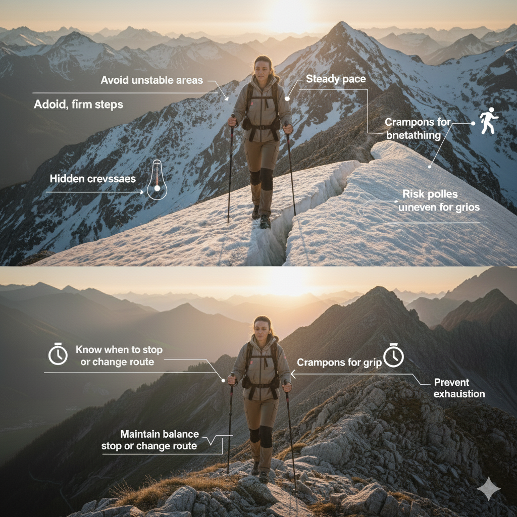 Each environment requires a different way of moving. It is not the same to walk along marked trails as it is to walk on rocky terrain, snow, ice, dense forests, or steep slopes. Mountaineers must adjust their technique, pace, and posture according to the type of terrain, always seeking stability and energy conservation.