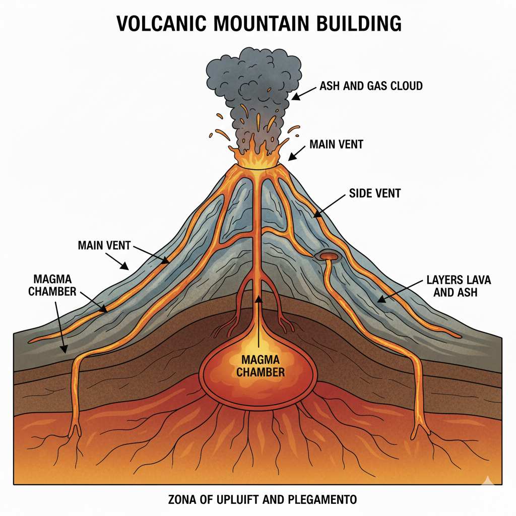 Volcanic activity, which builds mountains from lava and ash